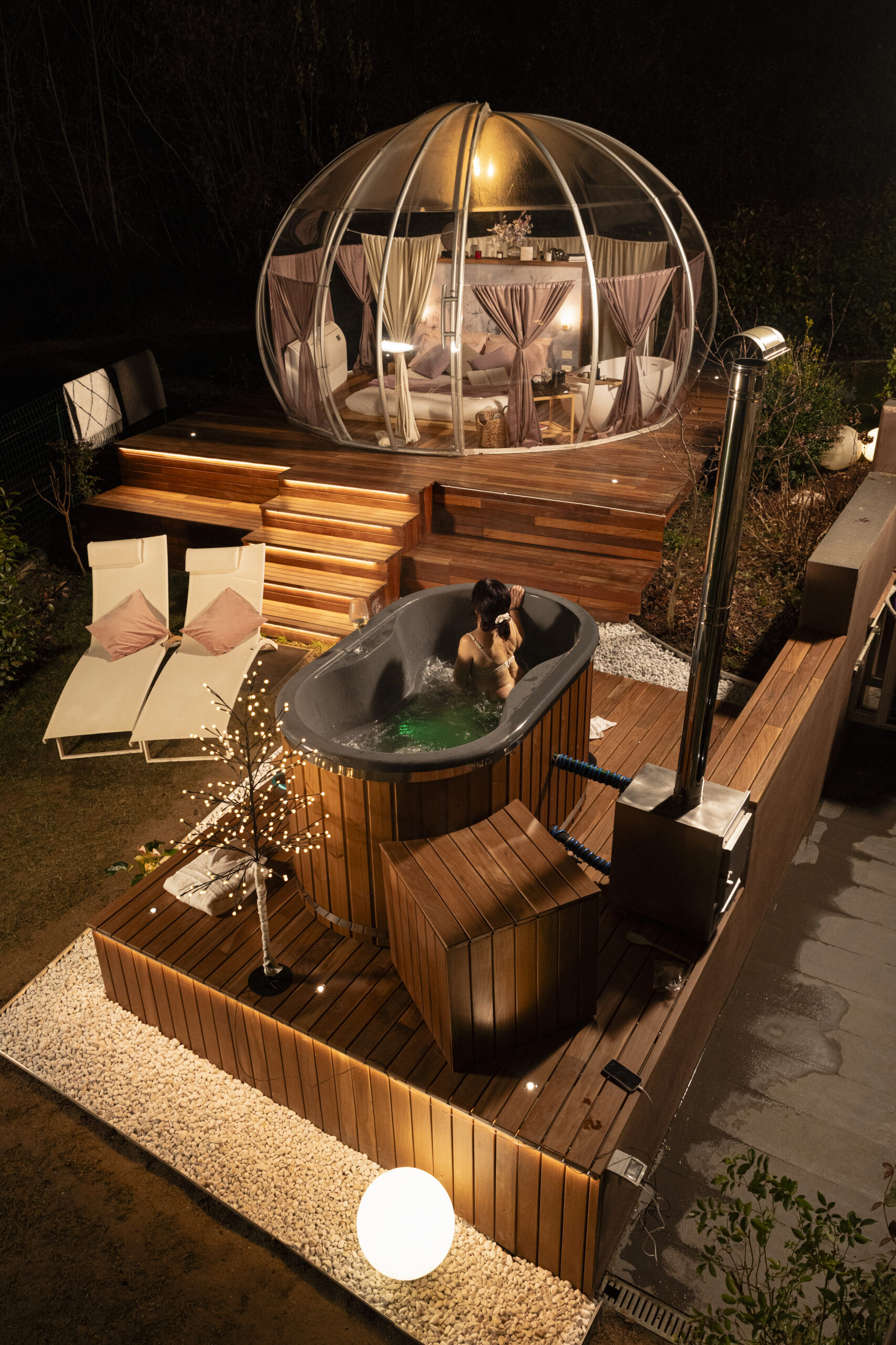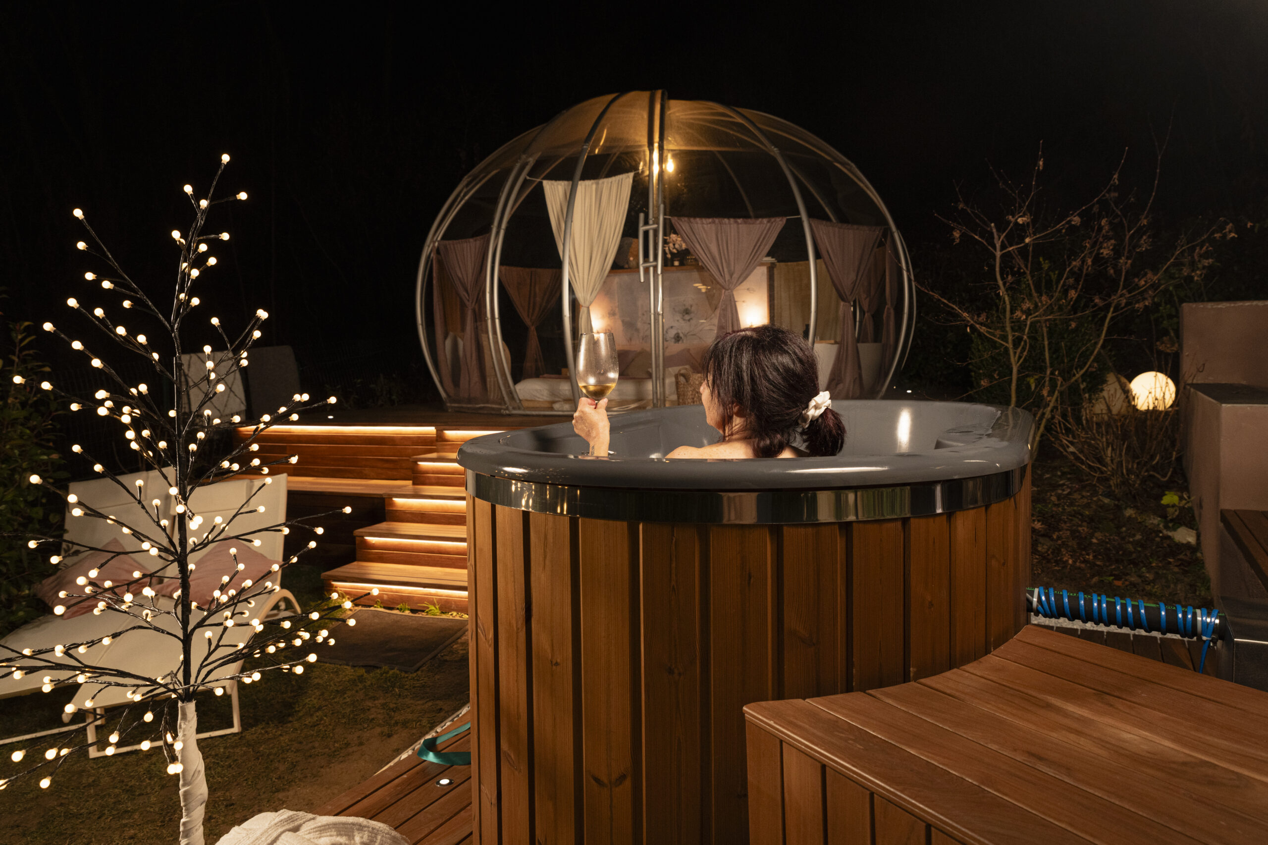 All’interno della bolla troverai il futon e tatami, bagno privato e vasca in Corian, riservata a una sola coppia per volta.